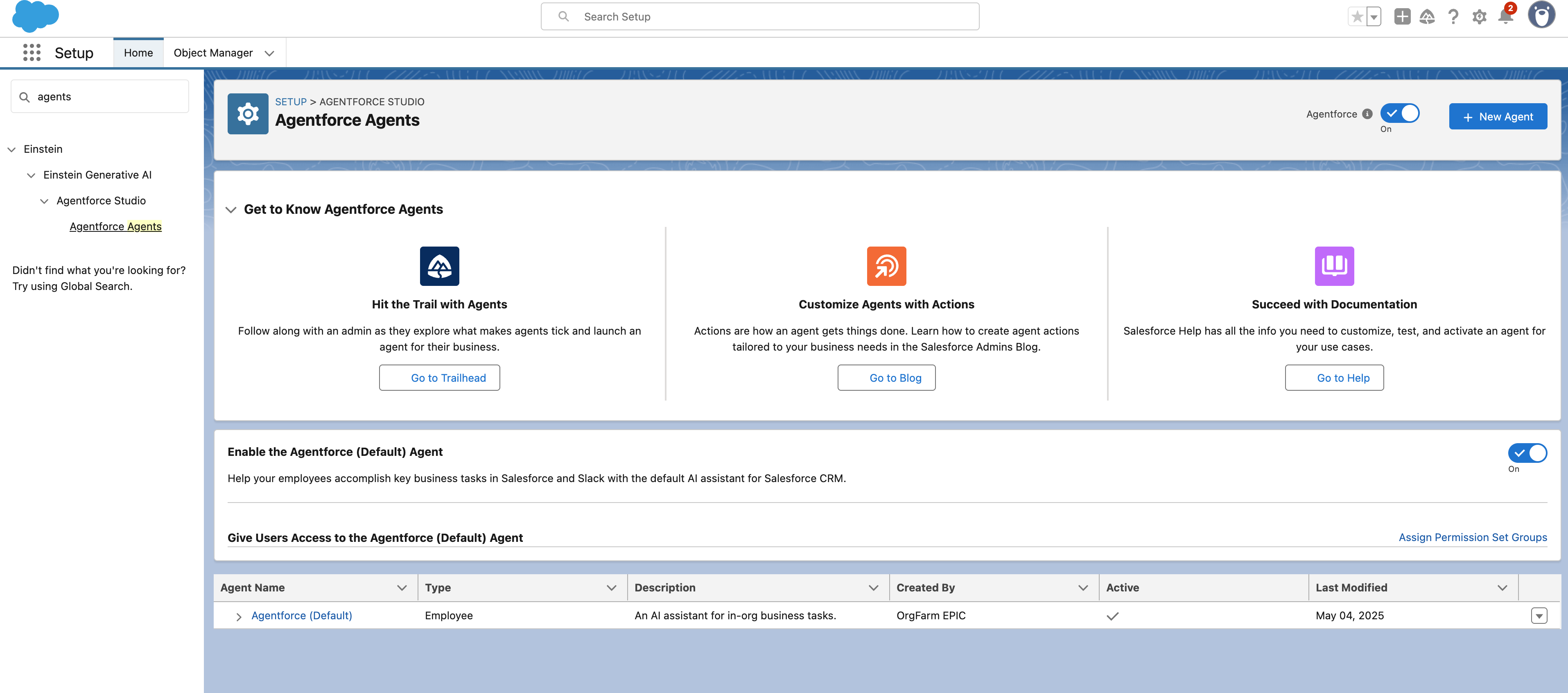 - In the Quick Find box on the left, type Agents and click Agentforce Agents