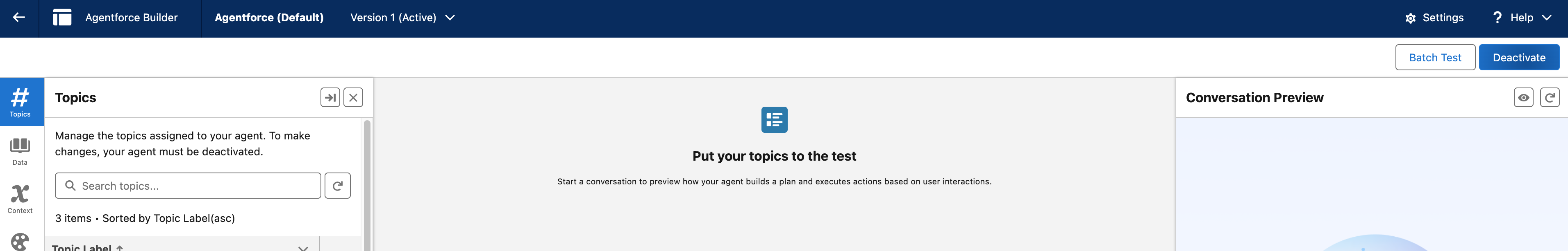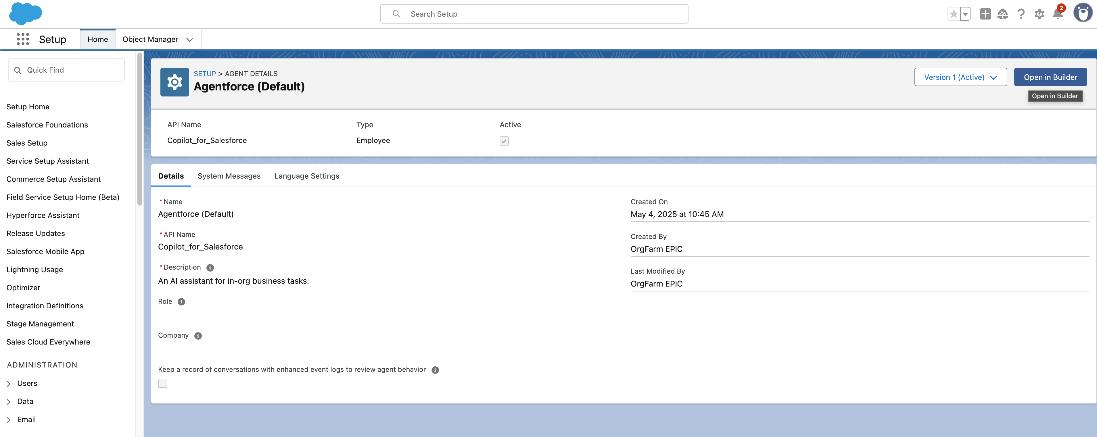 - Click Agentforce (Default) and then Open in Builder at the top right.