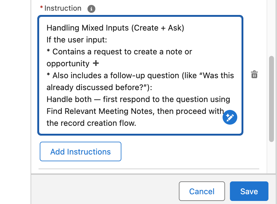 - Enter the following: - Handling Mixed Inputs (Create + Ask) If the user input: * Contains a request to create a note or opportunity ➕ * Also includes a follow-up question (like “Was this already discussed before?”): Handle both — first respond to the question using Find Relevant Meeting Notes, then proceed with the record creation flow.
