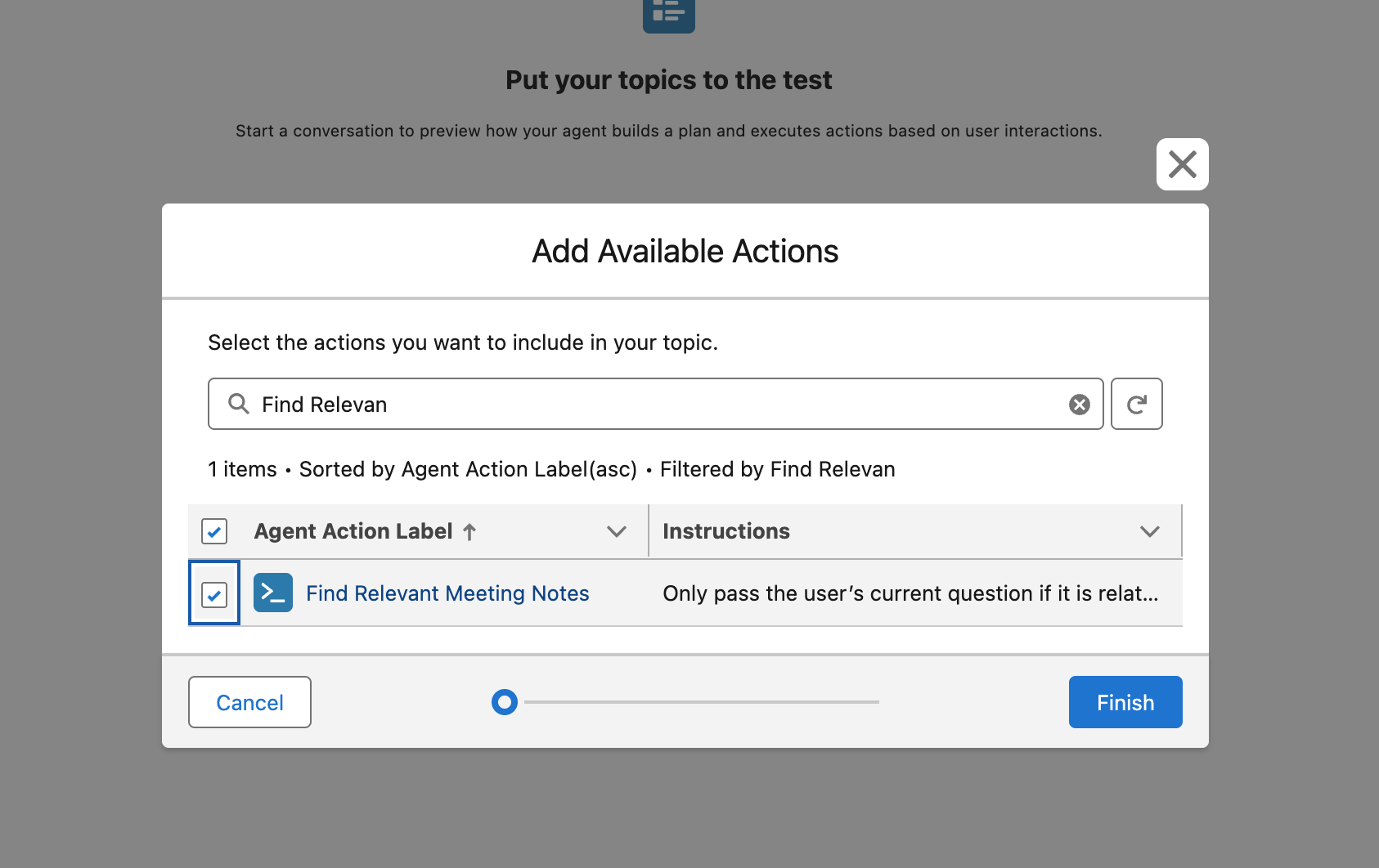 - Change the Agent Action Label to Find Relevant Meeting Notes